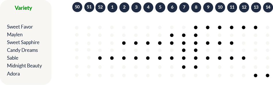 An early variety, 9 days before Santina. High yield, notable for its high soluble solids content, firmness, and excellent post-harvest performance.