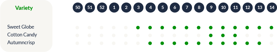 Harvested in mid-January. Notable for its productive potential, excellent size, and uniformity. Red skin with yellow hues and white flesh. It remains fresh for 40 days post-harvest.